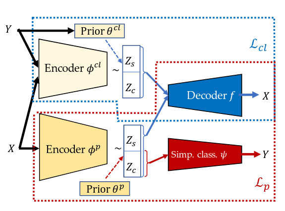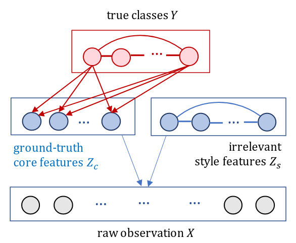 \(\mathbf{z}_c\) and \(\mathbf{z}_s\), where \(s\) denotes “style” features and \(c\) denotes “core” features–only core features are relevant for prediction.