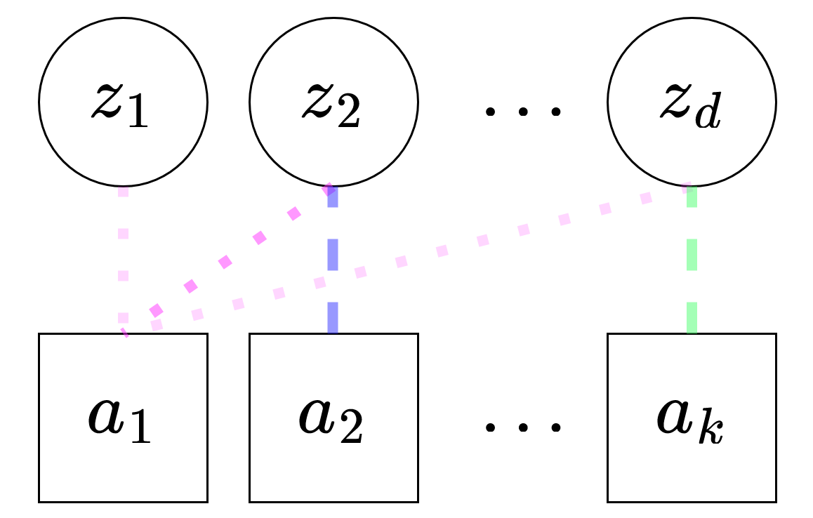 \[ z_i\ \mid\ a \sim \gamma_i^a\mathrm{Normal}(\mu_i^a, 1) + (1 - \gamma_i^a)\mathrm{Normal}(0,1),\ \mathbf{z} \in \mathbb{R}^d \\ \pi_i^a \sim \mathrm{Beta}(1, K) \\ \gamma_i^a \sim \mathrm{Bernoulli}(\pi_i^a), \]